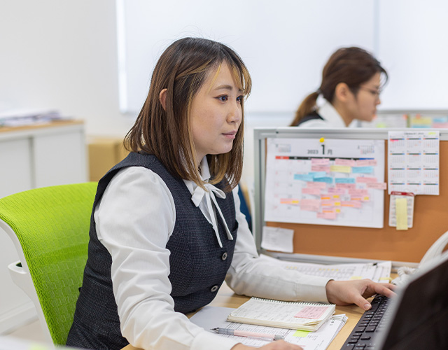 佐藤所長の下で所長が安心して外出し、営業活動に専念できるようにサポートをする仕事をしています。具体的には受発注業務、荷物の準備、仕入れのチェックといった事務作業や、来客・電話対応が中心です。当社は取り扱い品目の幅がひろく、商品を覚えるのも大変でしたが、じっくり時間をかけて丁寧に教えてもらえたので、安心して業務に取り組むことができました。